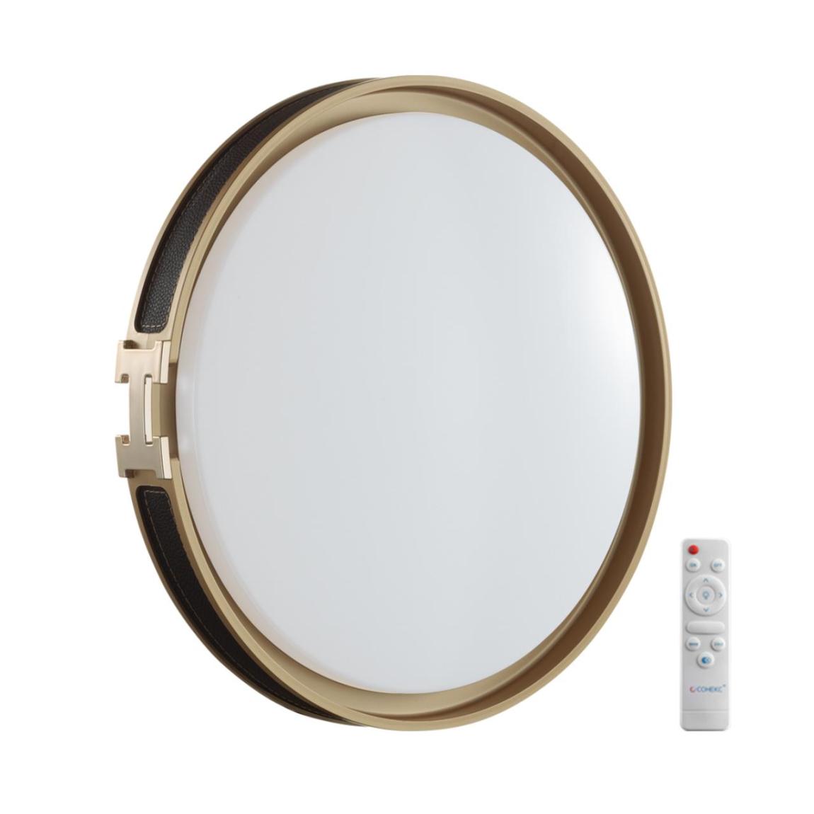 Светильник 7667/EL линии FAVEMO BLACK состоит из металлического основания (базы) и пластикового рассеивателя. Материал рассеивателя — высококачественный пластик марки PMMA 2.0 белого цвета с матовой поверхностью. Пластик обеспечивает светильнику равномерное рассеивание и хорошее светопропускание. Форма плафона: круглая, декорирована ободом из искусственной кожи черного цвета. Обод украшен декоративной вставкой в виде пряжки ремня из пластика золотого цвета. Степень защиты IP43 позволяет использовать светильник в определенных зонах влажных помещений. В комплект входит заменяемый LED-модуль с линзами мощностью 70 Вт, соответствующей лампе накаливания 610 Вт, а также пульт ДУ (с креплением на стену), с помощью которого осуществляется плавное изменение цветовой температуры в диапазоне 3000—6000К, изменение яркости, переход в режим переключения теплого/белого/холодного/ночного света. Светильник имеет функцию памяти.